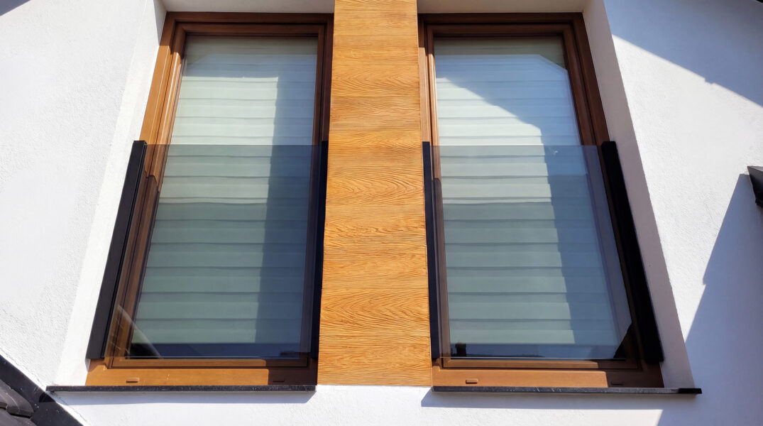 System naokienny oparty jest na dwóch profilach aluminiowych mocowanych do bocznych ościeżnic okna po lewej i prawej stronie ramy. Profile stabilnie trzymają taflę szkła na całej jej wysokości, równomiernie rozkładając obciążenia. Tafla szkła wsuwana jest od góry w uszczelki dopasowane do jej grubości bez wiercenia, bez rotul, bez kotew. Montaż możliwy do stolarki z drewna, PCV i metalu.