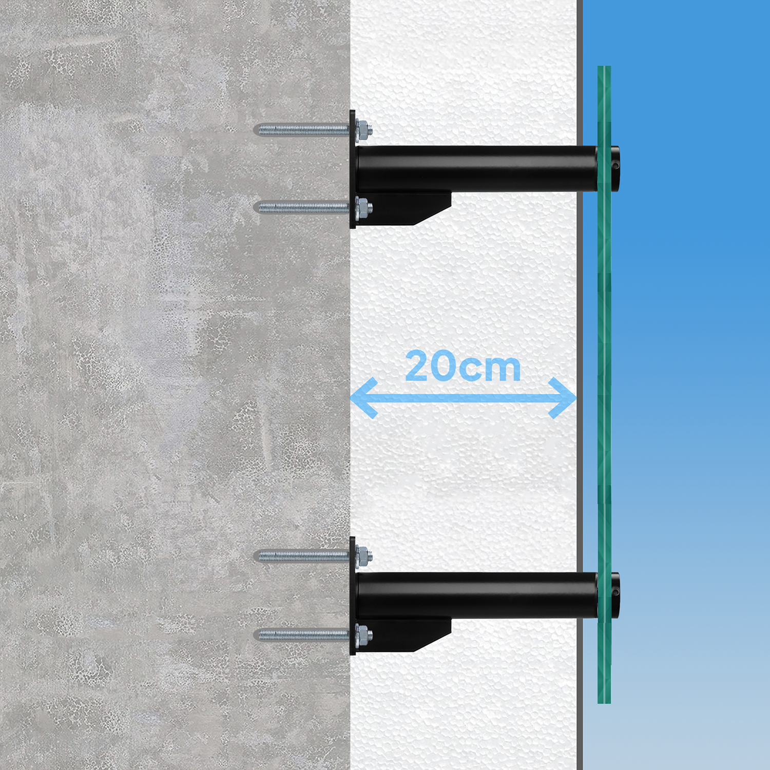 To system mocowania szklanej balustrady okiennej oparty na tubach ze stali nierdzewnej kotwionymi do ściany i rotulach fi 50 utrzymujących taflę szkła. Tuby osadzane są przed rozpoczęciem prac elewacyjnych – warstwa ocieplenia układana jest wokół tub, a po zakończeniu prac elewacyjnych widoczna jest tuba, rotula i tafla szkła.